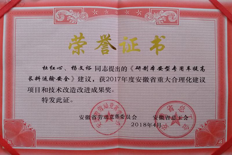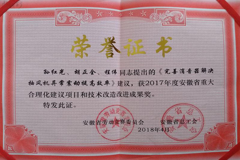 近日,从安徽省劳动竞赛委员会、安徽省总工会传来喜讯,好博体育煤矿提出的《完善消音器解决抽风机异常震动提高效率》、《研制本安型专用车提高长料运输安全》,荣获2017年度安徽省重大合理化建议项目和技术改造改进成果奖。