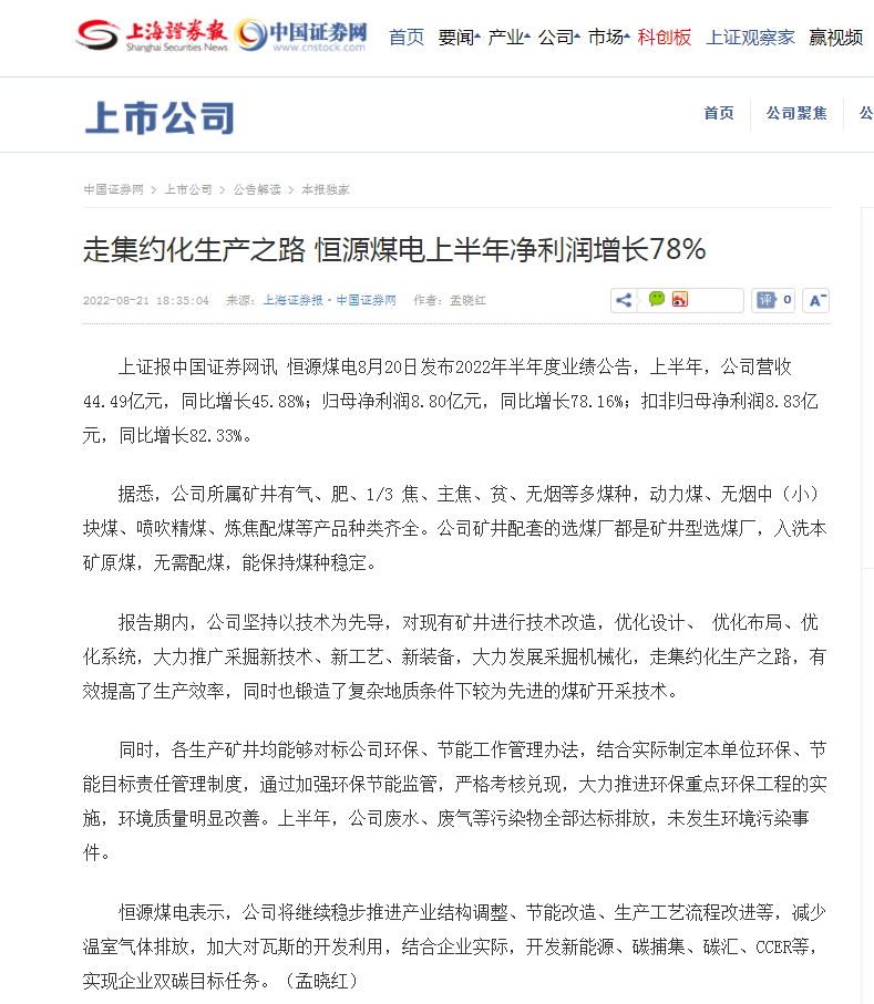 中国证券网2022年8月21日报道,走集约化生产之路 好博体育煤电上半年净利润增长78%