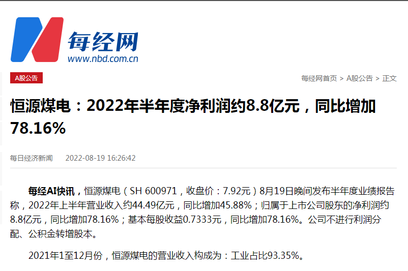 每日经济网:好博体育煤电:2022年半年度净利润约8.8亿元,同比增加78.16%