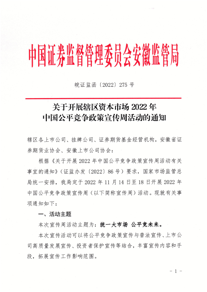 关于开展辖区资本市场2022年中国公平竞争政策宣传周活动的通知