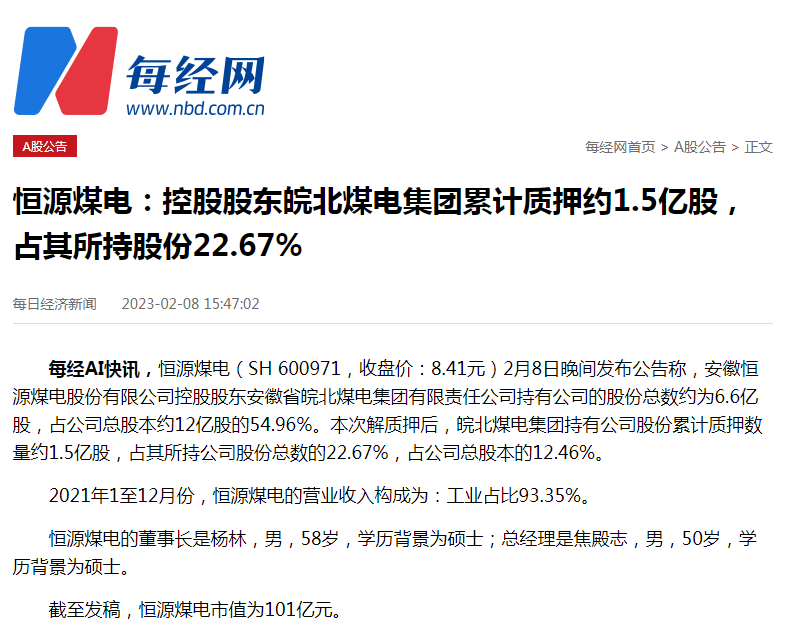 每日经济新闻:好博体育煤电:控股股东皖北煤电集团累计质押约1.5亿股,占其所持股份22.67%