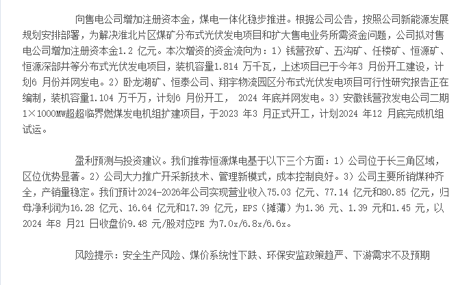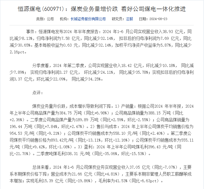 新浪财经:煤炭业务量增价跌 看好公司煤电一体化推进