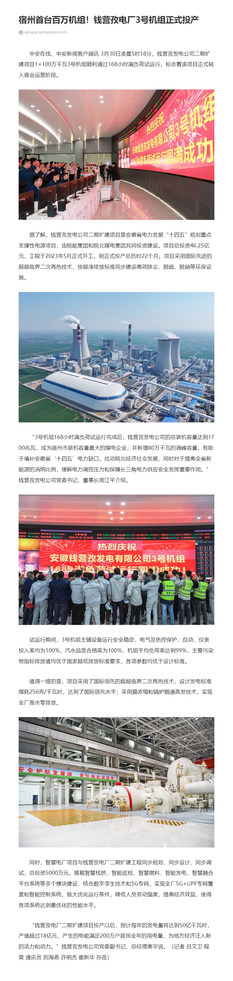 宿州首台百万机组!钱营孜电厂3号机组正式投产